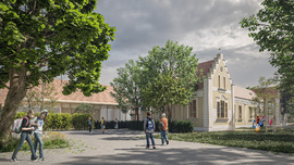 A jelenleg tantermeket magába foglaló, általunk műemlékként kezelt fejépület a funkcionális nehézségek ellenére meghatározó karaktert, utcai „arcot” ad az iskolának, aminek egy modern oktatási intézménybe történő integrálását izgalmas építészeti feladatnak tekintettük. Fontos volt ezért számunkra, hogy az új épületrészek nekonkuráljanak a volt Evva-kastéllyal, hanem szolidabb elemekként megjelenve összességében olyan intézményt hozzunk létre, ami hangsúlyozottan tiszteletben tartja a régi helyi értékeket.